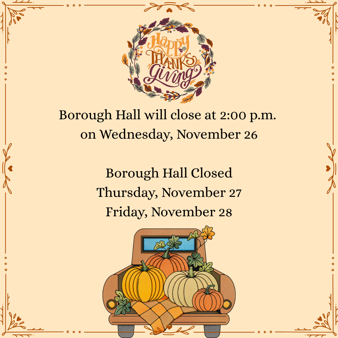 Borough Hall will close at 2:00 p.m. on Wednesday, November 26. Borough Hall will be closed on Thursday, November 27 and Friday, November 28. Thank you